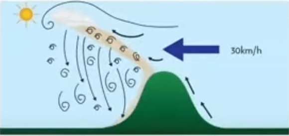 2-Tepenin büyüklüğü de kritik bir öneme sahiptir. Tepe ne kadar büyükse arka tarafında rotordan etkilenmeyen korunaklı bir alan oluşturma olasılığı artar. Bruce kitabında 3000 mt yüksekliğe sahip dağlara sahip bir bölgede 50 km hakim rüzgarın olduğu yerde rüzgaraltında güvenli bir şekilde uçulabildiğinden bahsediyor. İngiltere de ise çoğu tepenin 500 mt den küçük olduğu için rüzgaraltında uçmanın sakıncalı olduğundan bahsediyor. Bir de dikkat edilmesi gereken bir nokta rüzgaraltına girilecekse sınırlarında gezmektense tamamen girilmesi gerekiyor korunaklı alanda yer almak için,türbülans kenarlarda daha fazla hissediliyor.