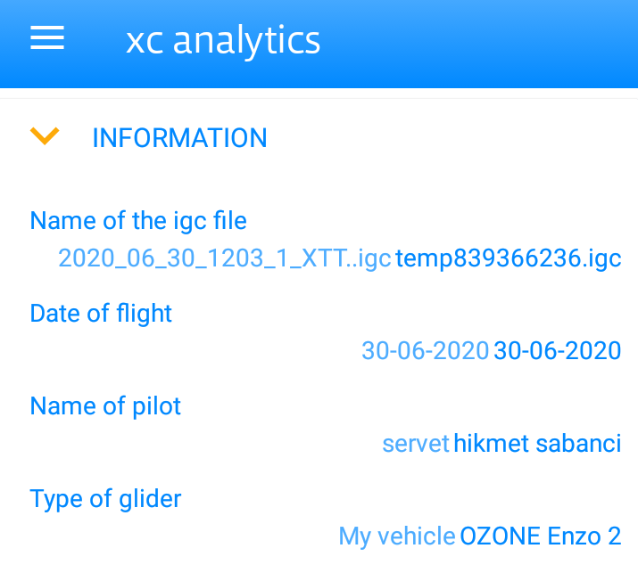 Xc Analytics istatistik verilerinde ilk sekme bilgi (information) bölümü. Sol taraftaki sütunda benim uçuşun verileri yer alırken sağ taraftaki sütunda Hikmet’in uçuşunun verileri olacak.