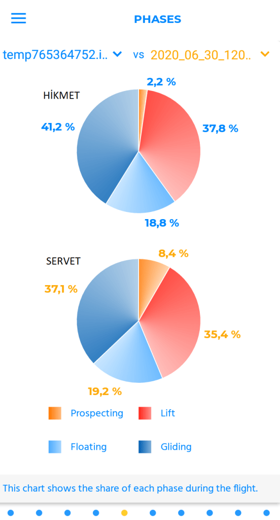 Yukarıda uçuş fazlarına göre yüzdesel dağılımını gösteren grafik var. İlk bakışta hemen dikkatimizi çeken şey turuncu olarak gösterilen Araştırma fazının bende %8,4 iken Hikmetde ise %2,2 olduğunu görüyoruz. Yani bu şu anlama geliyor Hikmet’in termik bulmakta ve merkezlemekle ilgili hiçbir problemi yok. Aksine normalde en iyi uçanlarda bile ortalama %3 iken bunun bile altına düşmeyi başarmış.
