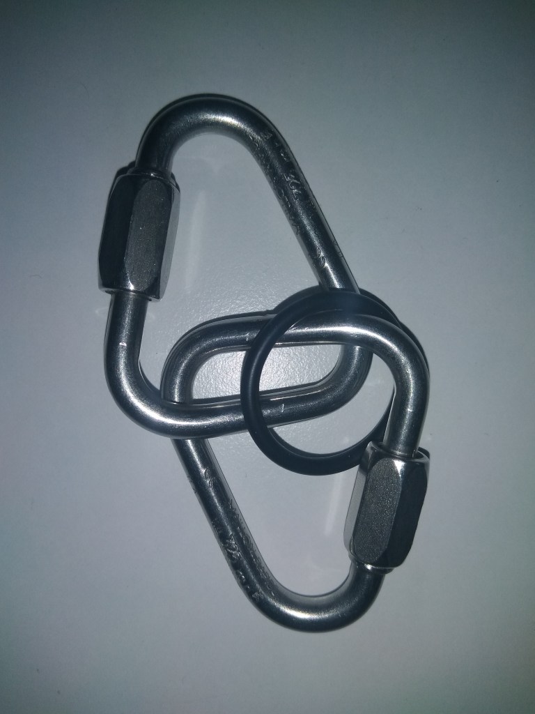 Yedek kolonu ile harness kolonu arasında kullanılan kilitli karabinalar genelde 7mm kalınlığında oval ya da dörtgen karabinalar oluyor. Bunlarda diğer kilitli karabinalarda dikkat etmemiz gereken iki değer var. Güvenli taşıma yükü ve kopma yükü. Güvenli taşıma yükü bir ağırlığı uzun süre boyunca taşıma kapasitesi. Kopma yükü ise ani bir şok ile yüklendiğindeki dayanma kapasitesi.