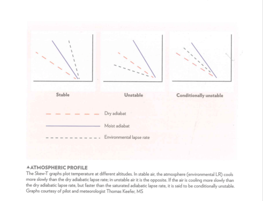 4. Lapse Oranı (Lapse Rate): Havanın irtifa ile ne kadar hızlı soğuduğunu ifade eder. Bir termiğin araziden ayrıldıktan sonraki yüzücülüğünden sorumludur. Çevredeki hava, termalden daha hızlı soğuyorsa (dengesiz/unstable), termal yükselmeye devam eder. Daha yavaş soğuyorsa (dengeli/stable), termal yavaşlar ve durur.