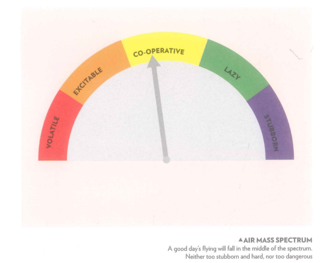 Bu spektrum üzerinde “inatçı” (stubborn), “tembel” (lazy), “işbirlikçi” (co-operative), “heyecanlı” (excitable) ve “değişken” (volatile) gibi farklı hava karakterleri tanımlanır. En iyi tarif, bol güneş ışığının olduğu “işbirlikçi” koşullardır. Bunlar, aşırı gelişim riski olmayan, yüksek tabanlı, kullanılabilir bulutlu ve öngörülebilir termallere sahip, ders kitaplarına uygun XC koşullarıdır
