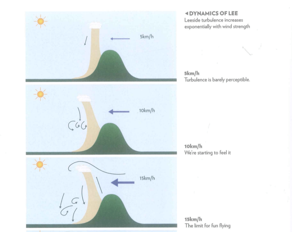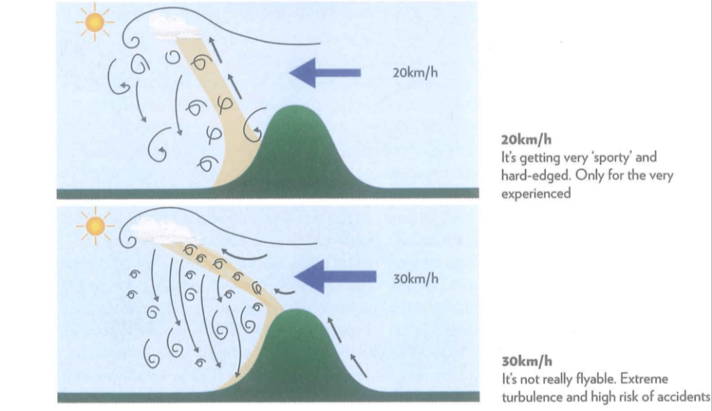 • 30 km/s: Uçulabilir değildir. Aşırı türbülans ve yüksek kaza riski vardır. Bu rüzgara çok güçlü bir bahar tırmanışı eklendiğinde, pilotun kanat kontrolünü kaybetmesi ve sonunda yedek paraşütünü kullanmak zorunda kalması muhtemeldir.