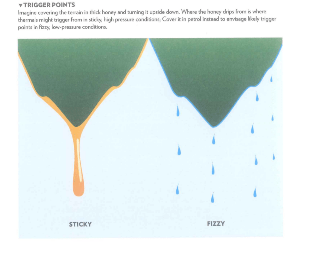 ◦ Alçak Basınçlı veya ‘Köpüklü’ (Fizzy) Günler: Bu günlerde hava kütlesi daha kararsızdır ve termaller araziden kolayca kopma eğilimindedir. Bu günlerde bulut tabanı genellikle daha alçaktır ve iyi hatlar sırtlardan daha uzakta bulunabilir.