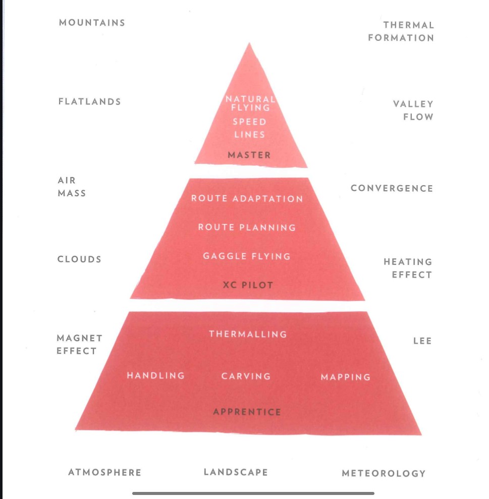 Yeni bir seriye başlıyoruz, Mastering paragliding adlı kitabın önemli bölümlerinin özetini bulacaksınız bu seride. Bu bölüm, kitabın ana konseptini oluşturur ve bir pilotun XC (mesafe) uçuşunda ustalaşmak için geçmesi gereken aşamaları yapılandırılmış bir modelle açıklar. Piramit, öğrenme sürecini üç ana seviyeye ayırır: Çırak, XC Pilotu ve Usta.